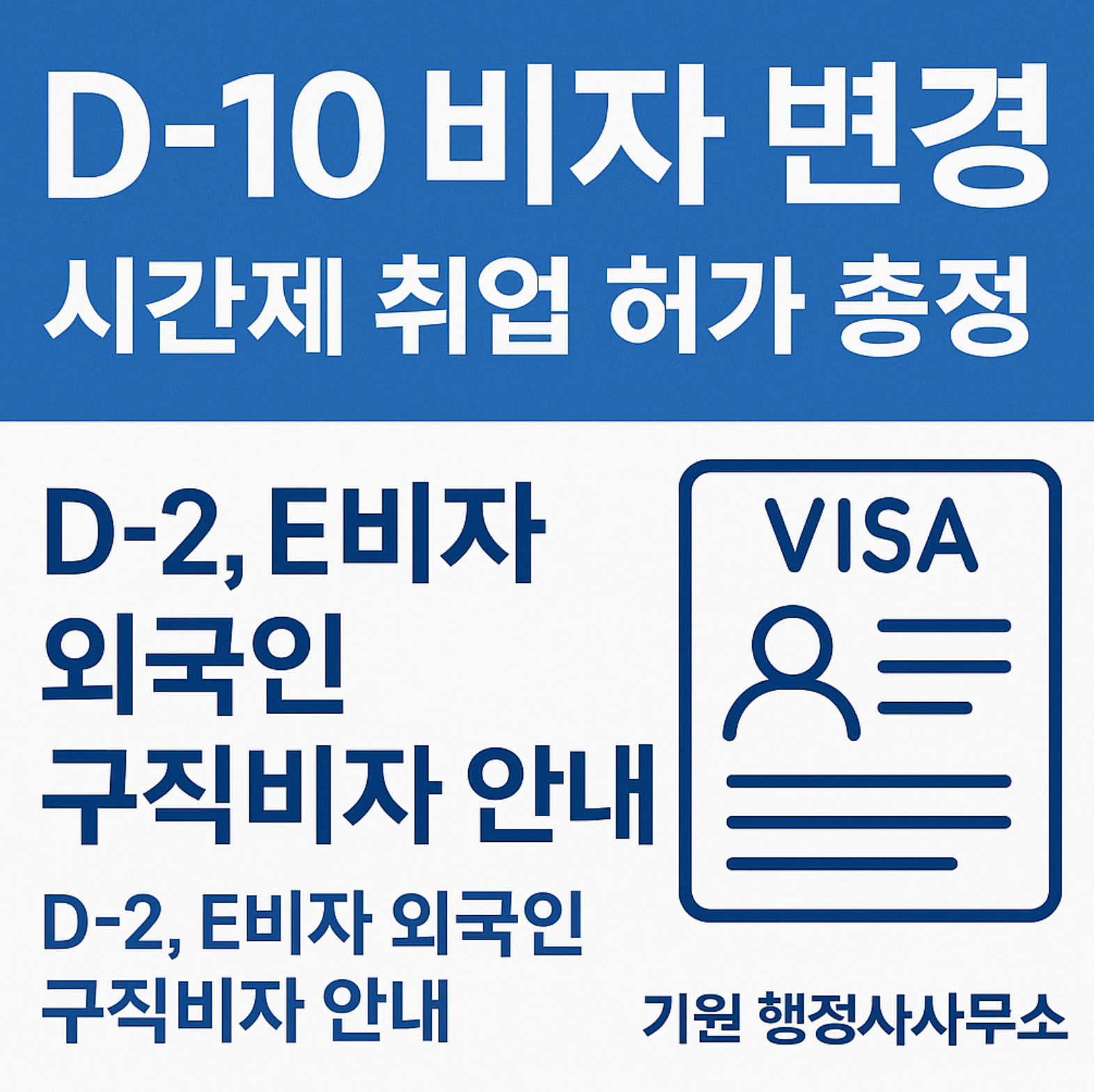 안녕하세요기원 행정사사무소입니다.최근 한국에 체류 중인 외국인 유학생(D-2 비자) 또는 전문 인력(E-1~E-7 비자) 소지자분들께서 **D-10 비자(구직비자)**로 체류자격을 변경하려는 문의가 많아지고 있습니다.오늘은 D-2, E비자에서 D-10으로 체류자격을 변경하는 절차와, 변경 후 시간제 취업 허가(아르바이트) 조건 및 준비서류에 대해 상세히 안내드립니다. ✅ D-10 비자란?|외국인 구직비자 개요D-10 비자는 외국인이 한국에서 취업 활동을 준비할 수 있도록 부여되는 구직 전용 체류자격입니다.원칙적으로 최대 2년까지 체류 연장 가능하며, 다음과 같은 전환이 허용됩니다.D-2 비자(유학생) → D-10 비자 가능E-1~E-7 비자(전문직) → D-10 비자 가능 (단, 아르바이트 제한 등 주..